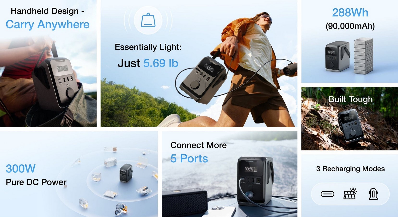 Strøm hele dagen i én hånd: Opptil 288 Wh kapasitet, tilsvarende ni powerbanker – ideelt for en hel dag med camping, fisking eller filming.