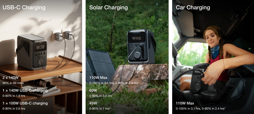 Nyt fleksibel lading via USB-C, billading eller solcellepaneler for pålitelig strøm i alle utendørssituasjoner.
